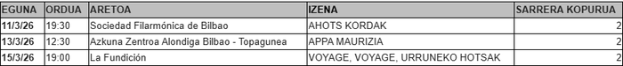 Kultur eskaintzea zabala izango da eta ikuskizun batzuetarako sarrerak, BEGITUn zozketatuko dira datozan asteetan. Holan, martiaren 11tik 15era egingo diran ikuskizunen artean, honeetarako sarrerak daukaguz BEGITUren irakurleen artean zozketatzeko: Ahots kordak, Appa Maurizia eta Voyage, Voyage, urruneko hotsak.
